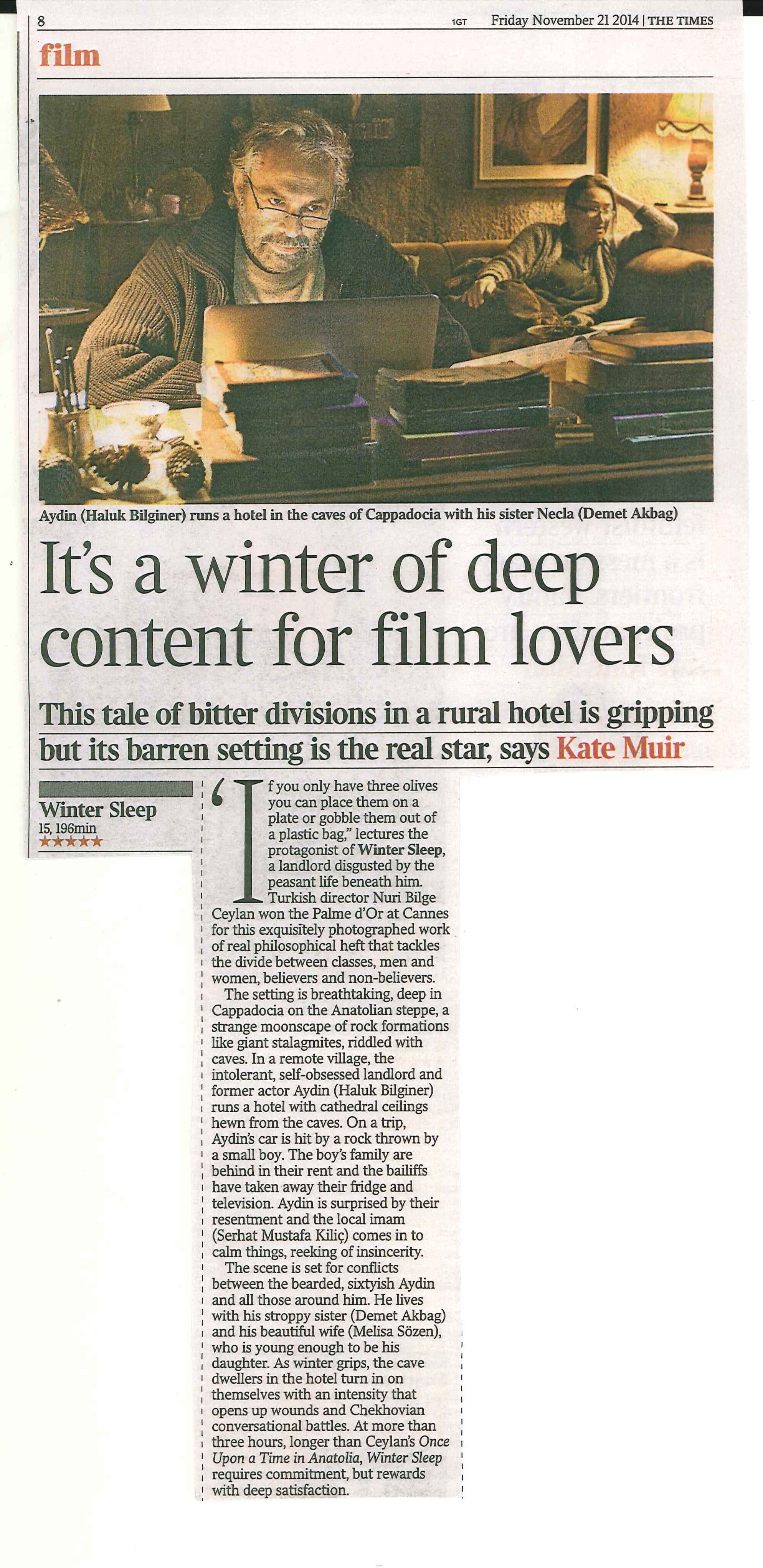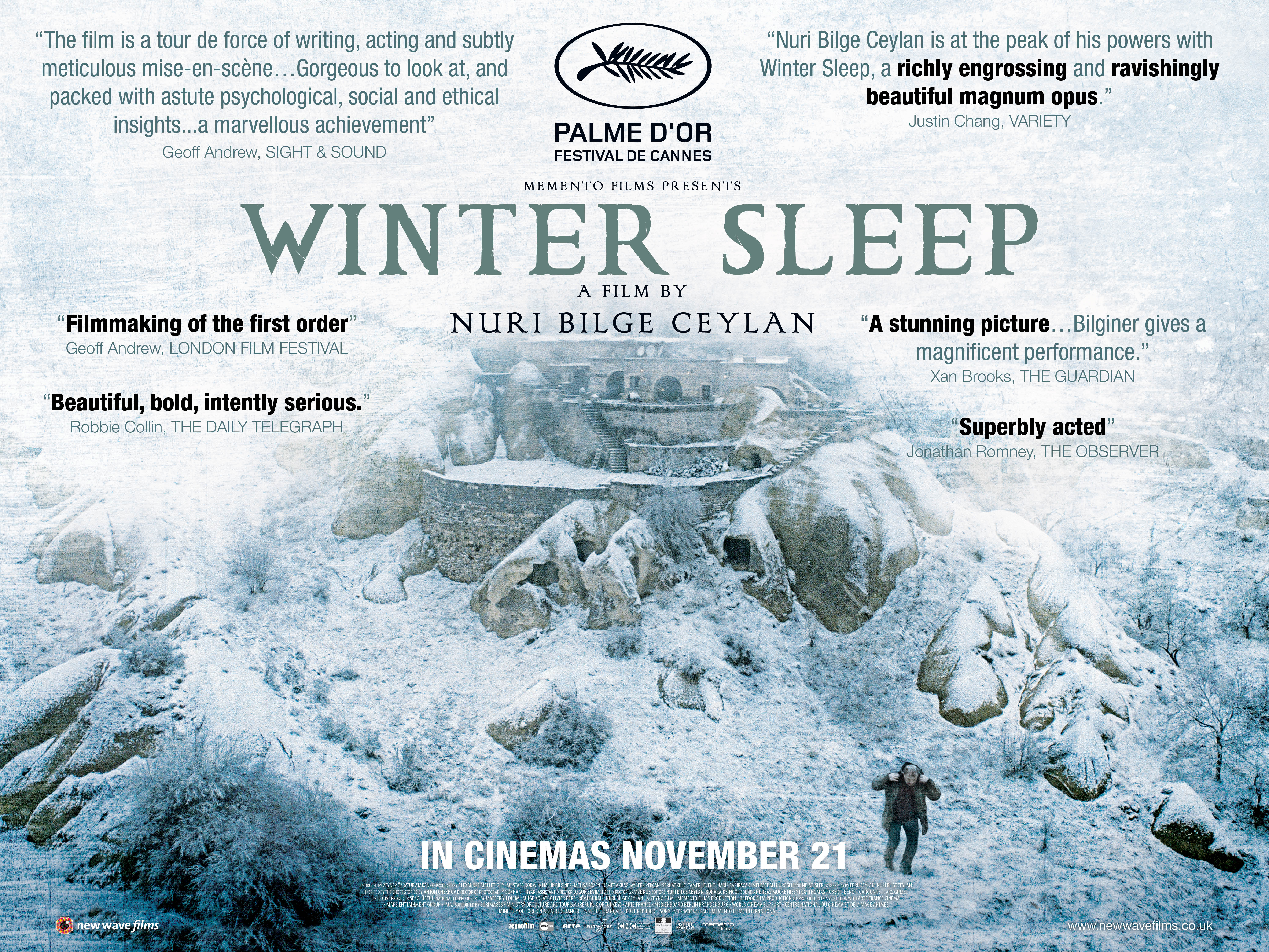 'In Winter Sleep Turkey’s Nuri Bilge Ceylan, of Once Upon a Time in Anatolia (Cannes Grand Jury prize), has made another testing marathon about human beings marooned in humanity. Again it’s glorious; again it’s talky; again its insights sear; again its length is remorseless. Again it’s the best thing to be seen in any city or country where it’s showing.'Nigel Andrews,