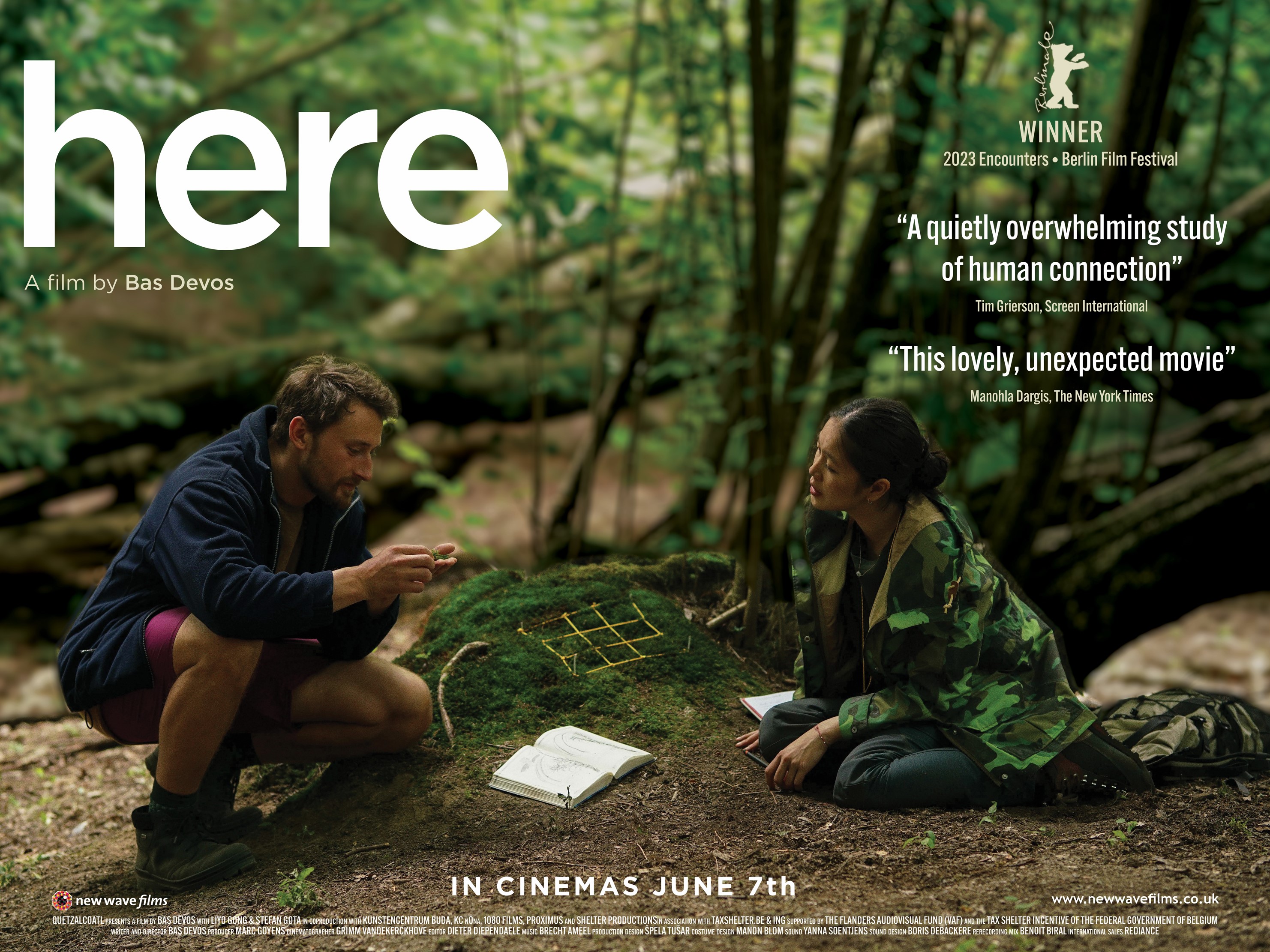 "A chance encounter changes two people’s lives in Here, the remarkable fourth feature from Belgian writer-director Bas Devos. This deceptively slender tale about a Romanian construction worker and a Belgian-Chinese bryologist (an expert in the study of moss and lichen) keeps its principal characters separate for most of the film’s 84-minute running time. But with gorgeous precision, Devos slowly brings these mismatched individuals into each other’s orbit, in the process crafting a quietly overwhelming study of human connection and our relationship with the natural world. Hardly a conventional love story, but achingly tender nonetheless, Here is fully present and dazzlingly alive."