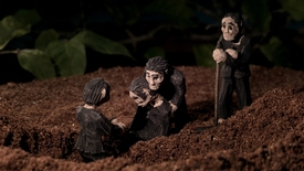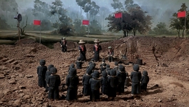 This is just one of hundreds of handmade clay figurines with which Panh recreates Phnom Penh as he remembers it, the camera tracking along miniature sidewalks and apartments as children and parents play tiny instruments and read tiny books. It is also how he recreates the camps, rendered as dioramas of jungle and rice paddy, with trees made of twigs, plastic leaves, and water droplets of epoxy resin. Despite their all-black uniforms, the prisoners remain as varied in appearance here as in the prewar flashbacks: bent by labor, curled up in pain, cheeks visibly gouged as they assemble in the dirt to listen to propaganda slogans like "There will be no more hunger."