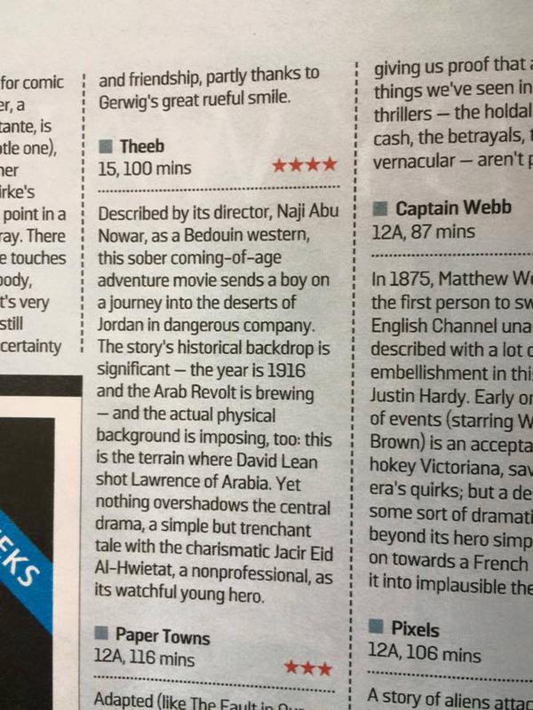 'There are echoes of Kipling and classic Westerns in the thrilling, award-winning adventure yarn Theeb…an epic journey fraught with danger, death and derring-do...A captivating story shot on breathtaking locations in southern Jordan that feels like a companion piece to Lawrence Of Arabia. Recommended.'